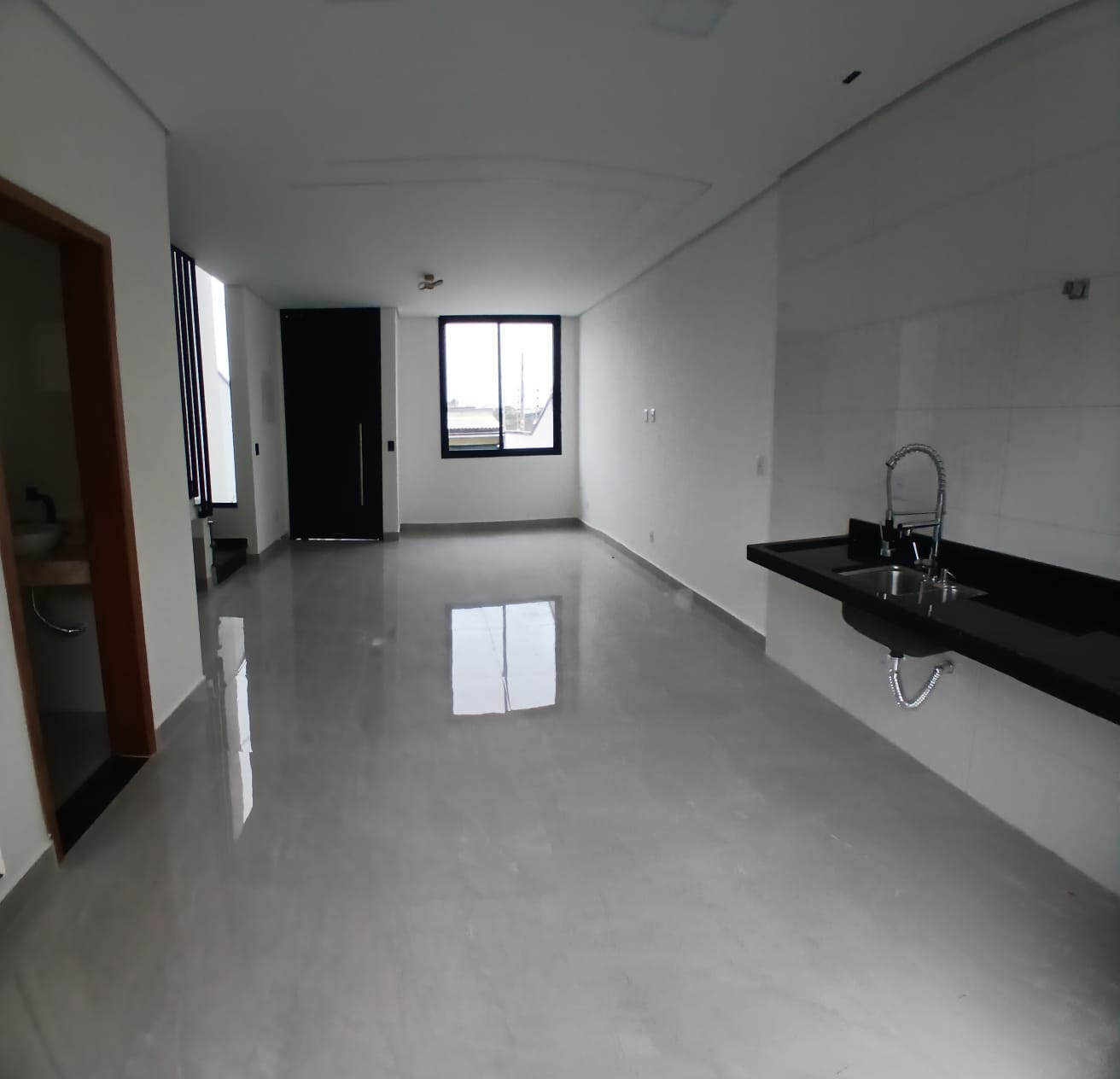 A sala integrada à cozinha cria um ambiente aberto, leve e funcional, do jeitinho que a vida moderna pede.